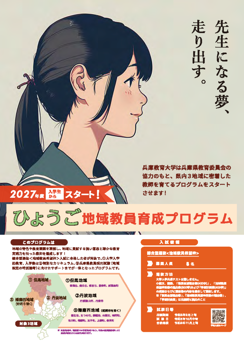 兵庫教育大学は、兵庫県教育委員会と連携・協働し、兵庫県教員採用試験(特別選考)で設定された3地域(但馬地域、丹波地域、播磨西地域(姫路市を除く。))で教師になろうとする者を対象として、①大学入学前からの教育、②入学後の特別なカリキュラム、③教員採用試験(特別選考)に向けたサポートが一体となった「ひょうご地域教員育成プログラム」を令和9年度本学入学生からスタートさせます。