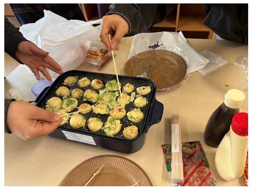 M1の時は、教育・言語・社会棟の6階の部屋だった。日当たりがよく、窓からは自然豊かなキャンパスを見渡せて、季節を感じることができた。M1は授業が多いため、院生室でオンラインの授業を受けたり、レポートを書いたり、お互いの関心ごとをおしゃべりしたり、いつも賑わっていた。ここでの楽しかった思い出は、たこ焼きパーティをしたこと。関西は「たこ焼き器」を持っている家庭が多いが、留学生や関西出身以外の方はたこ焼きを焼くのが初めての人も多く、関西の食文化を通じて交流でき楽しいひとときとなった。M1が終わって引っ越しをする時には、大学院生活も半分が過ぎてしまったのか・・・と、6階を離れることが寂しかったことを覚えている。