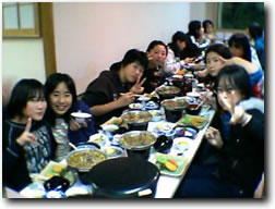 夕食です。みんなでパシャ!「京都の味付けもおいしおす。おうちのご飯もいいけど,たまにはこんなのもええどすなぁ。」 |