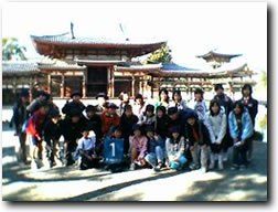 宇治平等院鳳凰堂の前で,クラスみんなでそろってパチリ。10円玉に刻まれていることでも有名ですね。 |