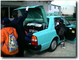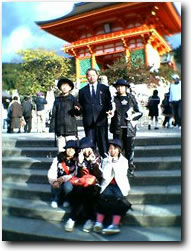 クループごとに別々のタクシーに乗って京都市内をみてまわります。事前に計画した訪問先へ,いざ行かん。「運転手さん,よろしくお願いします。」 |