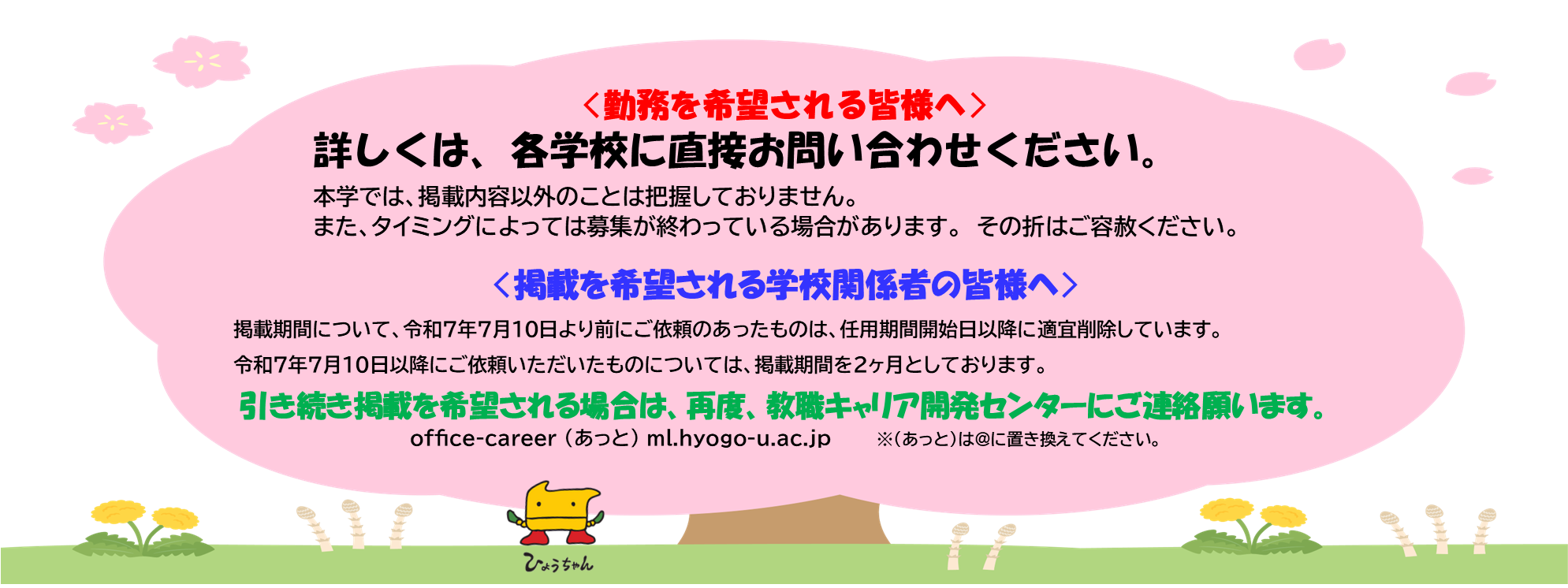 | 兵庫県立八鹿(ようか)高等学校 | 全日制普通科高等学校/国語1名 | 常勤講師 |