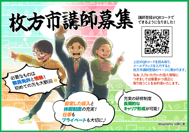 | 枚方市立小学校・中学校 | 小学校・中学校(全教科) | 枚方市立小学校・中学校 講師登録しませんか! 枚方市では小・中学校の講師希望者の登録受付を随時行っています。 ご興味のある方は「枚方市講師登録 LOGOフォーム」にご入力ください。後ほど枚方市教育委員会 教職員課よりお電話で面接日程を確認いたします。面接では講師登録履歴書(市販で可。顔写真貼付)を講師希望者ご本人がご持参ください。 こんな講師を求めています! ・こどもと共感し、積極的に心を開き、ともに学んでいこうとする。 ・こどもの指導に必要な専門的な知識や技能の習得に、常に前向きである。 ・こどもを中心に、保護者や地域の方と積極的に信頼関係を築こうとする。 |