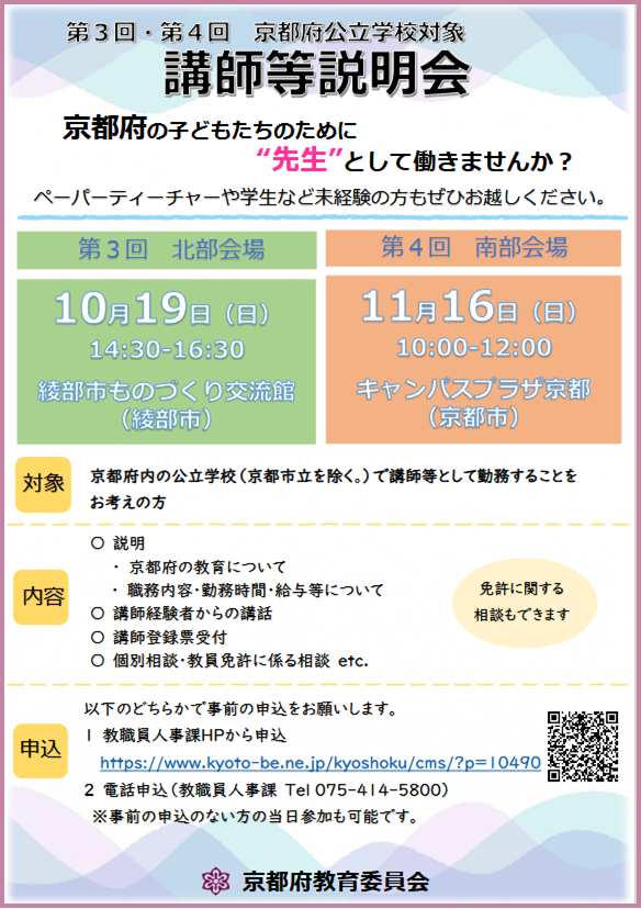 小学校・中学校・義務教育学校・高等学校・特別支援学校/常勤講師・非常勤講師 | R7年度京都府公立学校対象講師等説明会(第4回)のご案内 府内の公立学校(京都市立を除く)で講師や非常勤講師等を希望される方への説明会を開催いたします。ぜひお気軽にお越しください。 《第4回》令和7年11月16日(日) 10:00~ 会場:キャンパスプラザ京都 第4講義室 *申込フォームよりお申込みください。当日参加も可。(服装:自由) |