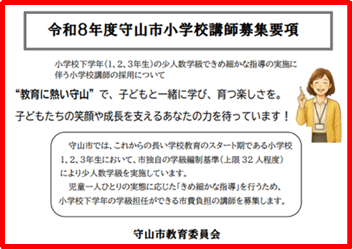 | 滋賀県守山市小学校 | 小学校 | 令和8年度守山市小学校講師募集のご案内 ・募集区分:小学校講師 小学校1、2、3年生(上限32人程度学級)の学級担任および校務担当業務 ・募集人数:5名程度 ・出願期間:令和7年10月7日(火)~令和7年11月7日(金)まで ・窓口:9:00~16:45まで / 郵送:令和7年11月7日(金) 消印有効 ※詳細は《募集要項》をご覧ください。 |