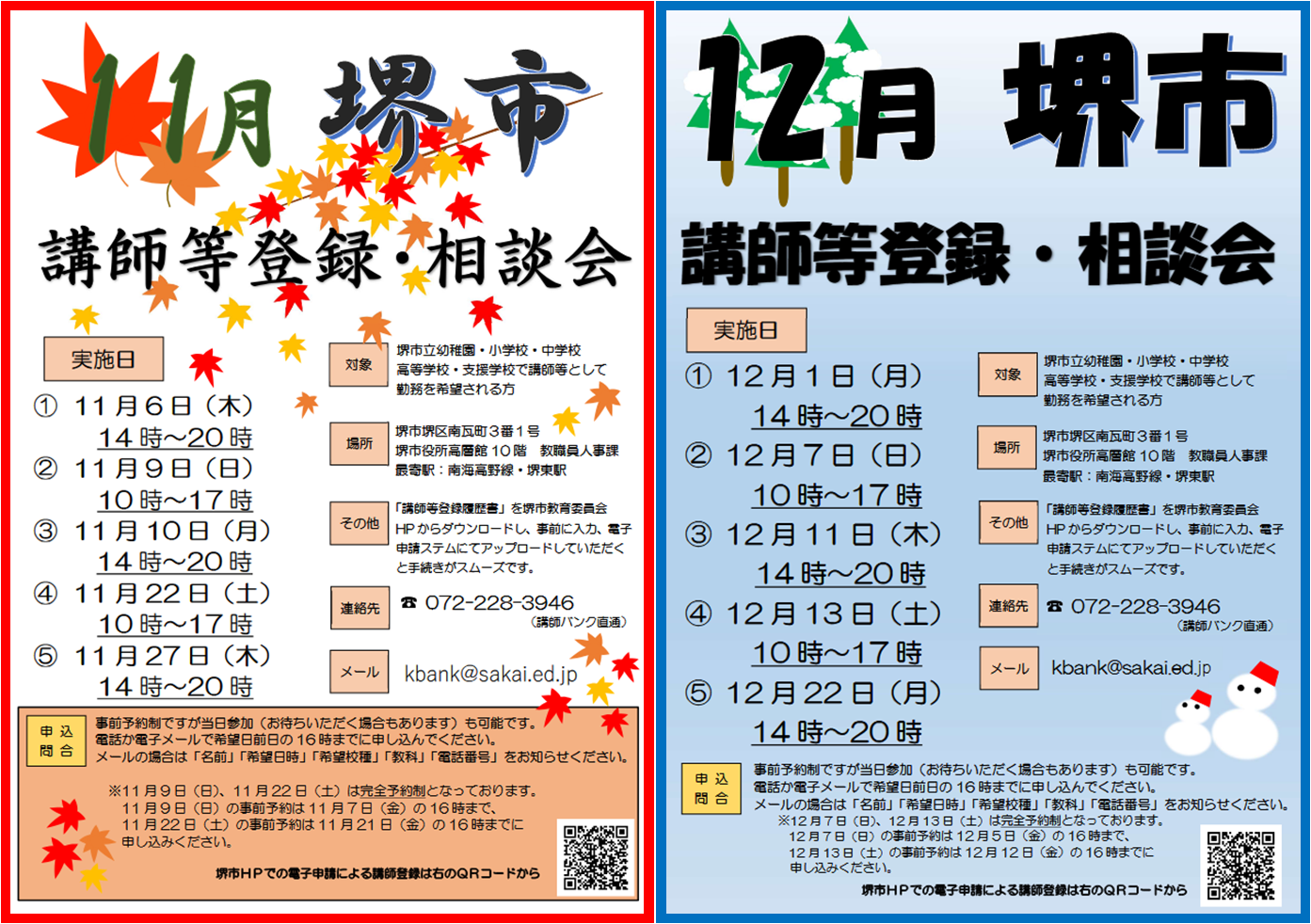 | 堺市立学校園 | 幼稚園・小学校・中学校・高等学校・特別支援学校 | 講師等(非常勤講師含む) | 堺市立学校園講師等の新規登録・相談会を実施します 登録に年齢制限はありません。まずはご相談ください。 11/22(土) 11/27(木) 12/1(月) 12/7(日) 12/11(木) 12/13(土) 12/22(月) 【平日:14時~20時 土日:10時~17時】 |