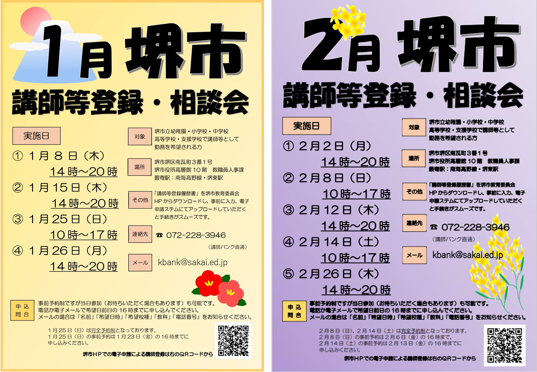 | 堺市立学校園 | 幼稚園・小学校・中学校・高等学校・特別支援学校 | 講師等(非常勤講師含む) | 1月・2月堺市立学校園講師等の新規登録・相談会を実施します 登録に年齢制限はありません。まずはご相談ください。 1/15(木) 25(日) 26(月) 2/2(月) 8(日) 12(木) 14(土) 26(木) 【平日:14時~20時 土日:10時~17時】 |
