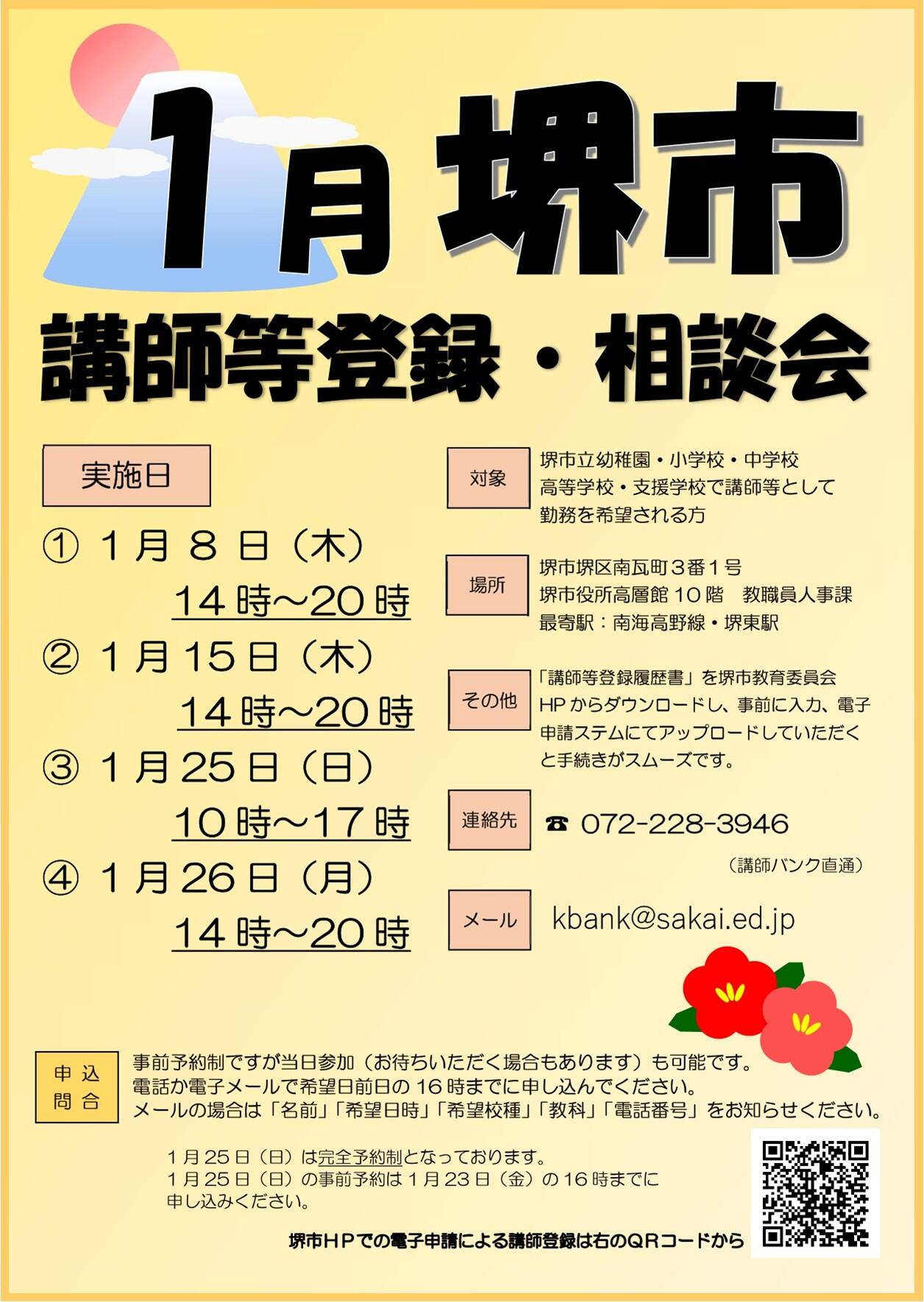 | 堺市立学校園 | 幼稚園・小学校・中学校・高等学校・特別支援学校 | 講師等(非常勤講師含む) | 堺市立学校園講師等の新規登録・相談会を実施します 登録に年齢制限はありません。まずはご相談ください。 1/8(木) 1/15(木) 1/25(日) 1/26(月) 【平日:14時~20時 土日:10時~17時】 |