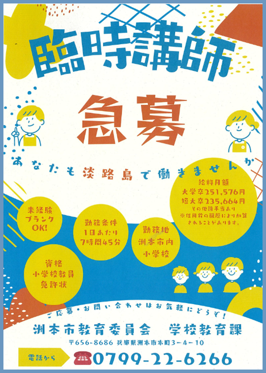 洲本市教育委員会より臨時講師急募のお知らせ ~あなたも淡路島で働きませんか~ 未経験・ブランクOK! 資格:小学校教員免許 勤務条件:1日あたり7時間45分 ※任用前の職歴により加算されることがあります。 詳細はこちらをご覧ください。 |