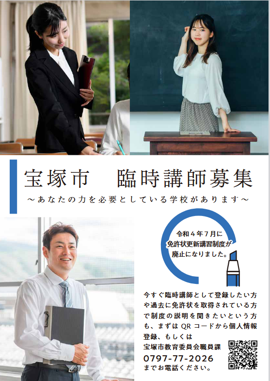 | 宝塚市内の小学校・中学校 | 小学校・中学校 | 常勤(非常勤も可) |