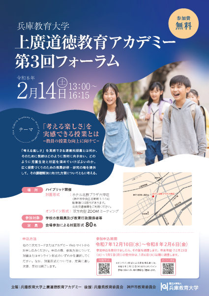 兵庫教育大学上廣道徳教育アカデミーでは、「「考える楽しさ」を実感できる授業とは -教員の授業力向上に向けて-」をテーマに、第3回フォーラムを開催します。