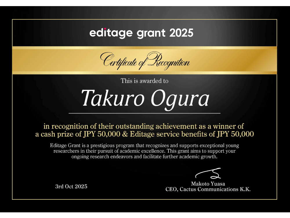 10月3日(金)、社会系教科マネジメントコース小倉拓郎准教授が、若手研究者向け助成金プログラム「エディテージ・グラント2025」において、次点を受賞しました。