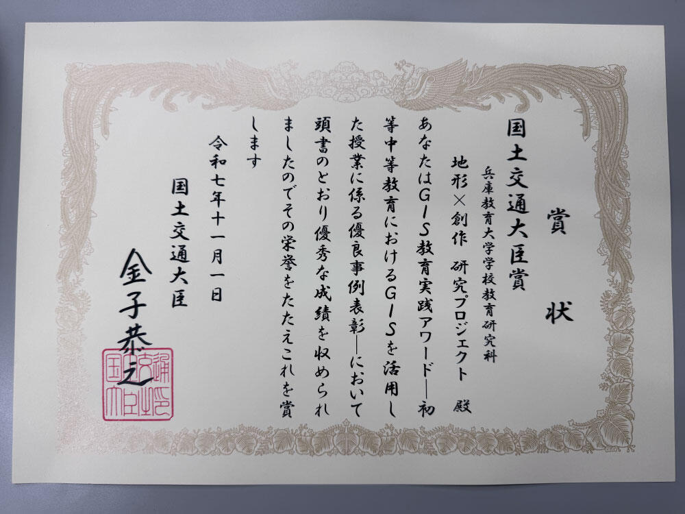 11月1日(土)、本学の研究グループ「地形×創作 研究プロジェクト(代表:社会系教科マネジメントコース小倉拓郎准教授)」の取組が、2025年度GIS教育実践アワード-初等中等教育におけるGISを活用した授業に係る優良事例表彰-において国土交通大臣賞を受賞しました。