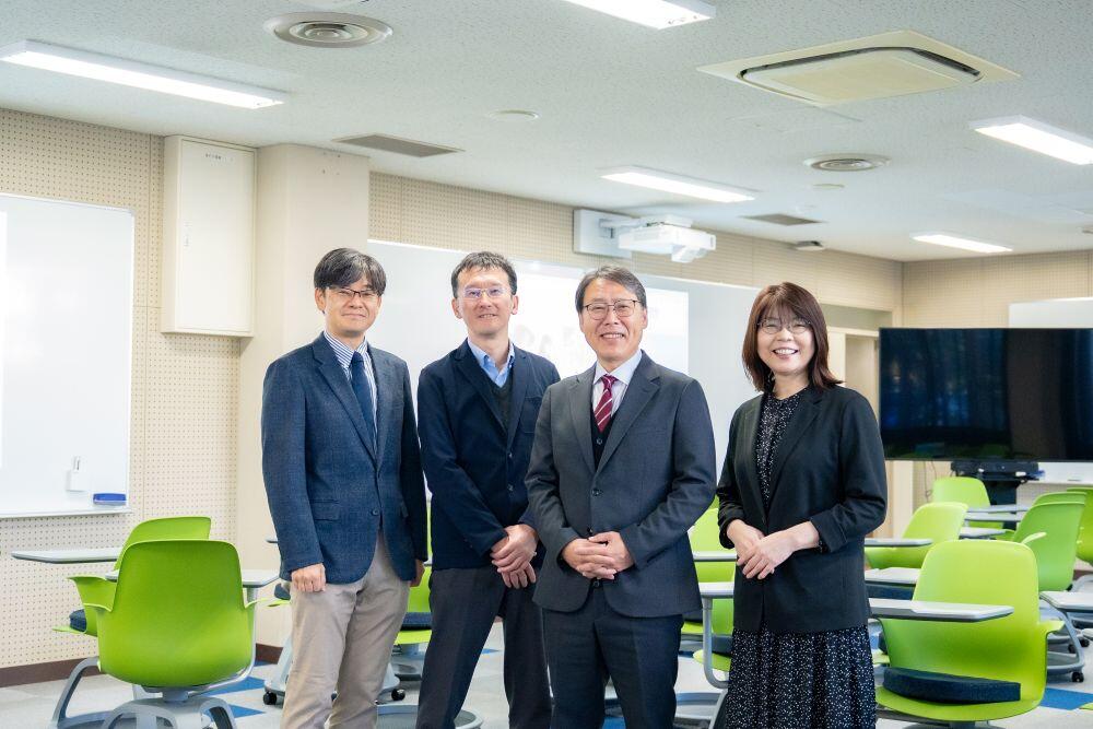 左から、川上泰彦教授、岡村章司教授、森山潤学長、永田智子副学長(開所式の様子)