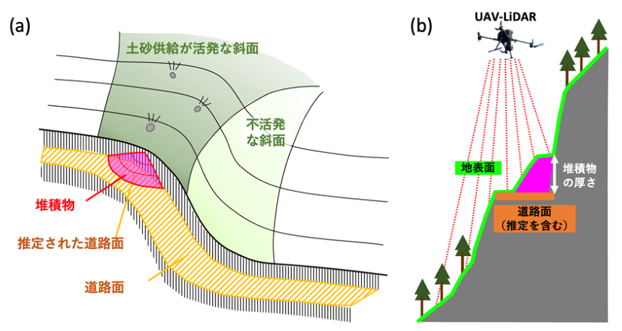左図(a)は道路の模式図であり、元の道路面に対して、堆積が生じている状況を模式的に示している。今回の分析では道路背後の地形条件に応じて、道路区間を複数に分割した。右図(b)では、UAV-LiDARを用いて道路面周辺の測量を行っている様子を示している。堆積物に隠れている元の道路面の高さを、周辺の堆積物に覆われていない道路面の標高から内挿して推定した。