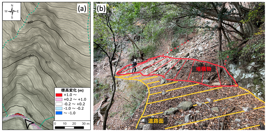 左図(a)は堆積物の位置とその背後の地形を示した地図であり、元の道路面に対して、背後に急傾斜かつ集水面積の大きい斜面がある場合に、道路上に堆積が多く生じている状況を示している。右図(b)は、左図(a)の矢印の方向に現地の状況を撮影した写真であり、斜面から道路面上に多量の堆積物が供給されている様子を示している。